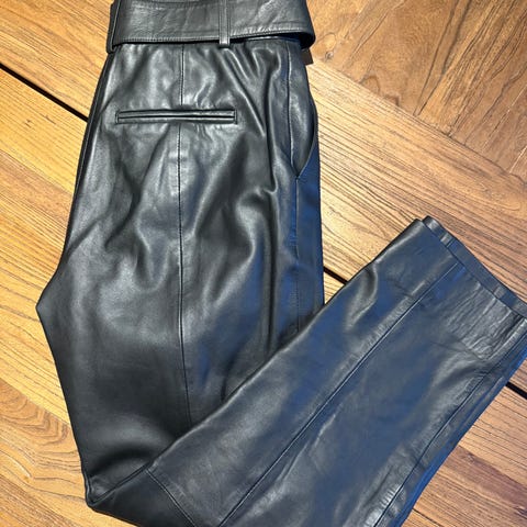 Kul skinnbukse (lammeskinn) i str 34. Fargen er litt ubestemmelig, mørk grønn/ mot litt brunt kanskje. Litt høy på livet, og croppet modell. Hentes i Tromsø eller sendes.