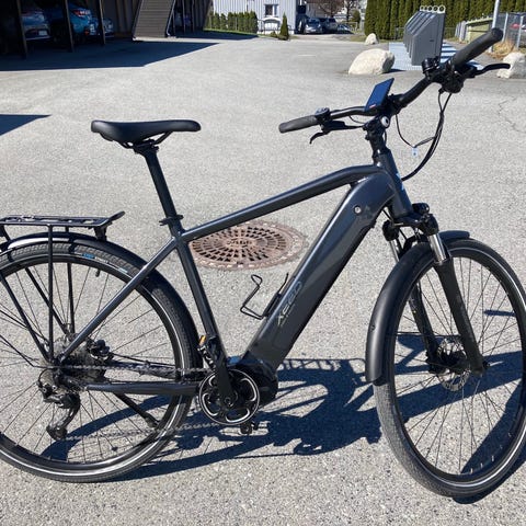 Ghost Hybrid sykkel med Bosch Performance Line motor. Sykkelen har et moderne design i grått og er utstyrt med en kraftig elektrisk motor for enklere sykling. Den har et digitalt display som viser hastighet og batteristatus. Perfekt for både bykjøring og lengre turer.
