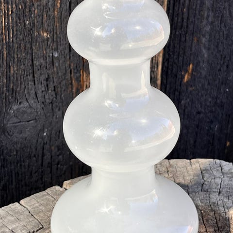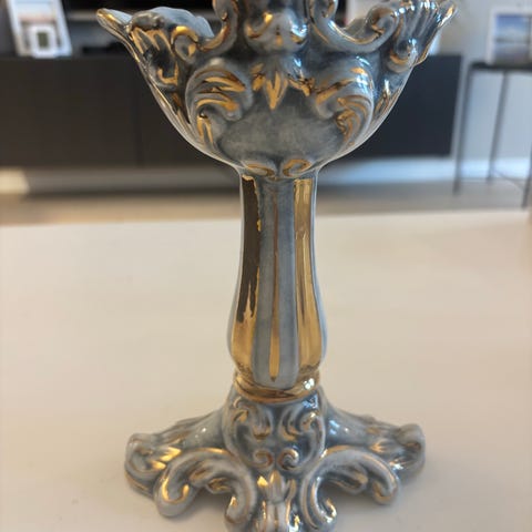 Selger en dekorativ vintage lysestake fra Italia (merket “Made in Italy” under). Produsert i Empoli-området på 1960–70-tallet, i presset glass med frostet/satinert lavendel-lilla farge. Elegant, klassisk form – et flott blikkfang til både moderne og retro interiør.
