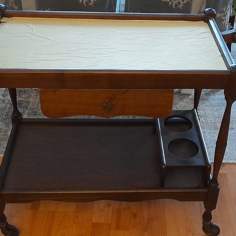Selges et sjarmerende serveringsbord fra 1950–60-tallet. Bordet har rette, enkle linjer typisk for skandinavisk design, og kombinerer treverk med en vakker, strukturert glassplate. Nederste hylle gir ekstra lagringsplass.