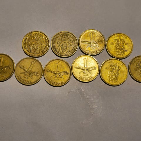 Danmark 10 stk 1 kroner 1926-1958 og 2 stk 2 kroner 1925+1958