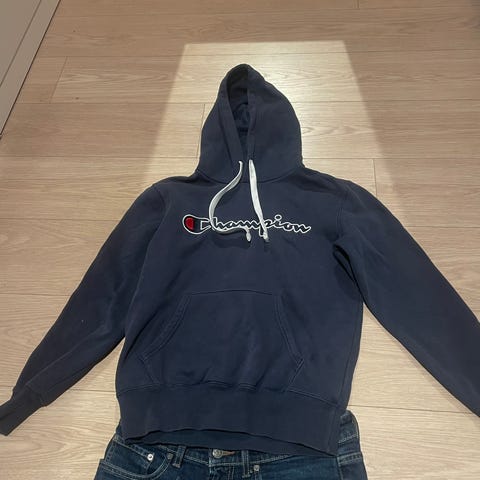 Sort hettegenser som har falmet litt i sortfargen. Det er en lomme på magen og det er glidelås i halsen.