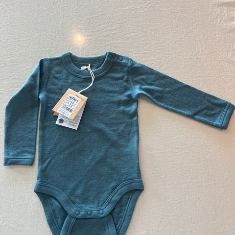 Svært pen ullbody fra Joha. Veldig deilig og myk merinoull, i skikkelig fin petroliumsblå farge. Denne har god passform og har holdt seg veldig fin i formen hele tiden. Har et hull på ryggen som er pent maskinsydd men dette er lite sjenerende og har ingenting å singer bruken. Vasket etter anvisning. Str. 90, brukt fra 86-98 her.