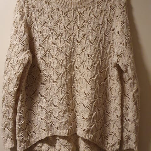 Behagelig damegenser med rund hals, merke Vila, i størrelse M. Offwhite. Genseren har et strikket mønster som gir et klassisk utseende. Halvlange armer. 60 % bomull og 40 % akryl.
