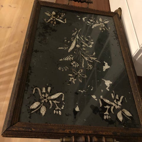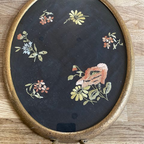 Arvegods. Et gammelt og dekorativt vakkert fat. En liten sprekk i hjørnet øverst (forsøkt å vise på ett av bildene). Heltre i hank og ramme, glass i overflate på fatet. fatet måler 44x27 - inklusive hankene. Selges for 400