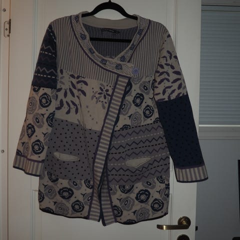 Svart/grå, zigzagmønstret, tunika/jakke/kjole (på meg), med broderte kontraster i rødt og gult. Litt kortere armer. 2 frontlommer. Stoffkledde knapper. V-utringet. Lenger bak enn foran. 100% bomull.