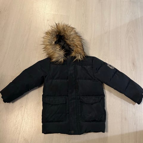 Tynn dunjakke fra Tufte. Det står str 110/116 i jakken, men den er liten i størrelse og tilsvarer heller en str 104. Avtakbar hette.