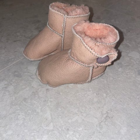 Rosa ullfôret baby booties fra Emu Australia, veldig lite brukt. Størrelse fra 0-6 måneder.