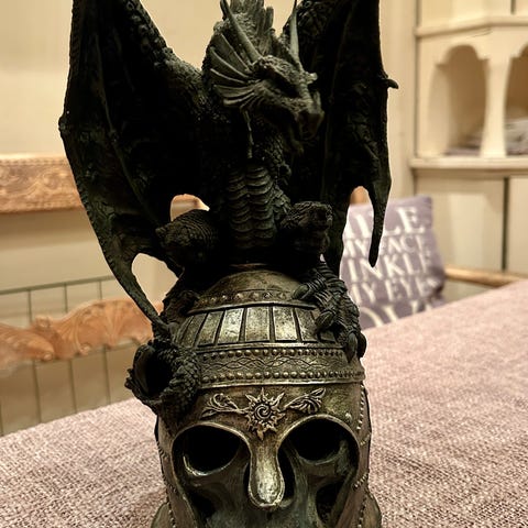 Statuen er i god stand, liten skade på halen og mangler en lenke som skulle gå fra kvinnens hånd til dragens hals.