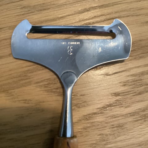 Vintage Spar ostehøvel med treskaft, jeg tror det er eik. Den er i fin stand. 17 cm lang.