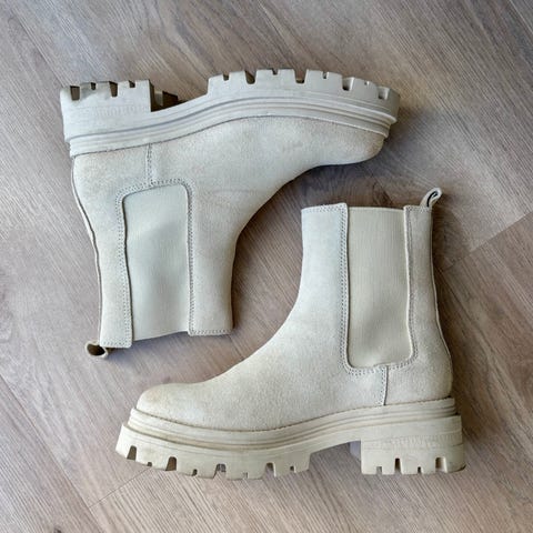Nye lys beige boots selges, brukt en gang, fremstår som nye