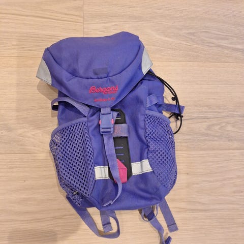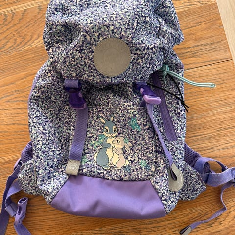 Barnehagesekk for de yngste. Noen få bruksmerker, men mye bruk igjen. Spenne foran, en lomme inn mot ryggen og nettinglommer på sidene.