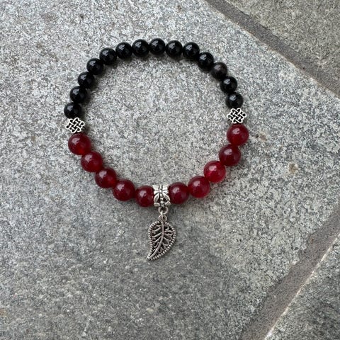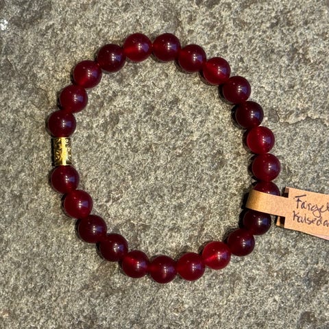 Håndlaget. Perlene måler ca 8 mm, og det er benyttet dobbel elastisk tråd.