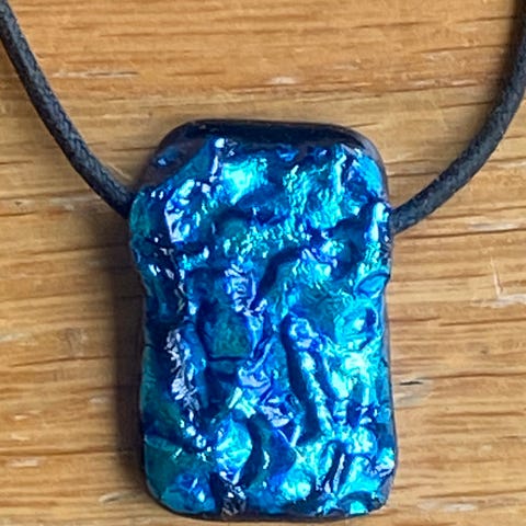 Labradoritt-lignende (plast) rundt anheng på svart halskjede.