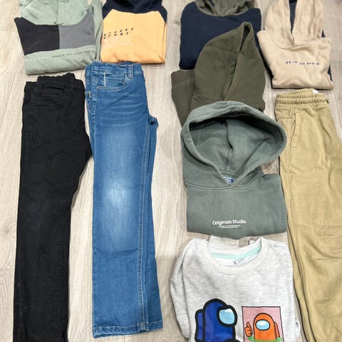Et sett i velour med bukse og hettejakke, med glidelås. Jakka er helt ubrukt, buksa er pent brukt uten noen anmerkninger. Fargen på klærne kommer ikke frem på bilde 1, så se bilde 2 for mer riktig farge.