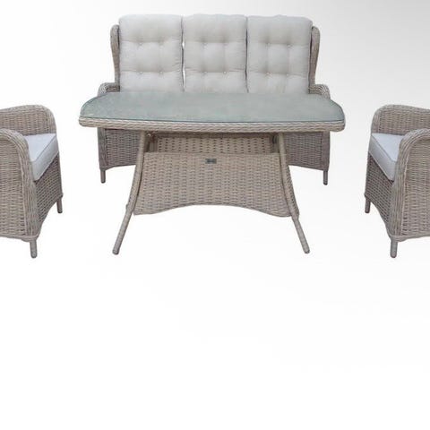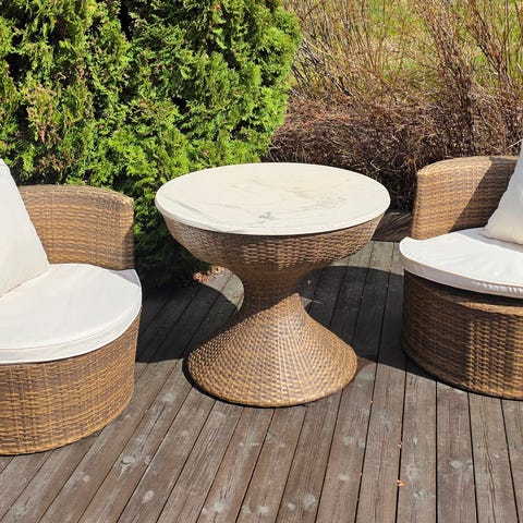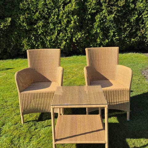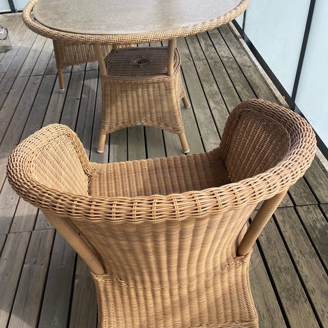 To stoler og et rundt bord til terrassen eller hagen. Gode å sitte i og lette å bære. Bambusen ser litt slitt ut, men er i god stand. Kan muligens behandles for å freshes opp litt?