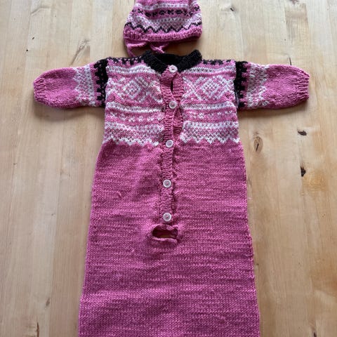 Hjemmestrikket bilstolpose med matchende lue. Helt ubrukt.
