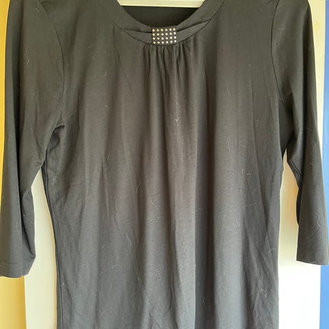 Elegant svart topp fra Brandtex B-Women i myk og stretchy kvalitet. Fin rund hals med pyntestein og gjennomsiktig detalj gir et eksklusivt uttrykk. Perfekt til både hverdags og fest.
