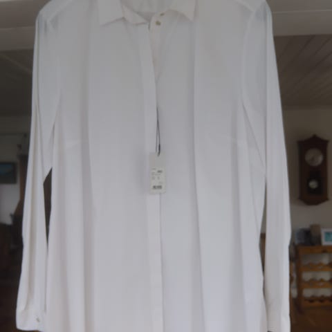 Klassisk hvit skjorte fra Brandtex B-Women i størrelse 46. Skjorten har krage og diskrete legg foran som gir et elegant uttrykk. Perfekt til både kontor og penere anledninger.
