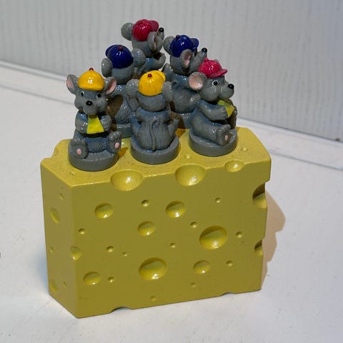Settet fra svenske Sagaform består av 6 ostekniver med keramisk skaft, utformet som smilende mus som spiser ost, plassert i en tilhørende "ostebit" av keramikk.