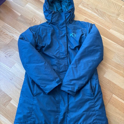 Kari Traa kåpe i størrelse M. Denne kåpen er gul og designet for kvinner. Den har et rutete fôr og er laget for å gi varme og komfort. Egnet for bruk i høst og kaldere vær, og har praktiske lommer og hette for ekstra beskyttelse.