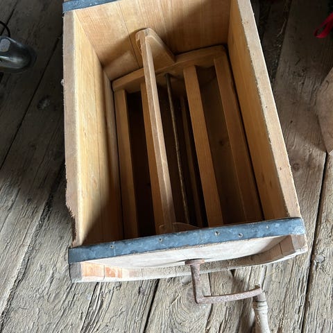 Original, gammel smørkinne i tre med jernbånd. Den er i god stand med flott patina og naturlig slitasje som gir den et autentisk, rustikt uttrykk. Perfekt som dekor i stue, hytte eller kjøkken – eller som et samlerobjekt for den som er glad i gamle bruksgjenstander.