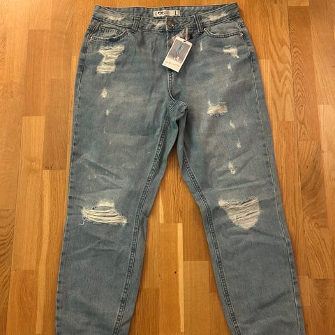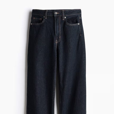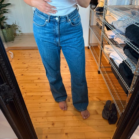 Selges en 5-lommersjeans i bomullsdenim uten stretch som i begynnelsen føles fast, men som med bruk blir mykere og ledigere. Rette ben med ledig passform fra midjen til hoftene. Bena har baggy passform fra lårene og ned. Høy midje og gylf med knapp og glidelås. Lengre lengde, designet for å ligge i krøll over foten. Et avslappet og kult denim statement.