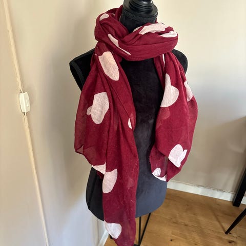 Stort og deilig skjerf i beige, dyp rød og marine. Kan også brukes som et teppe til sofaen. Nypris kr 2.200,-