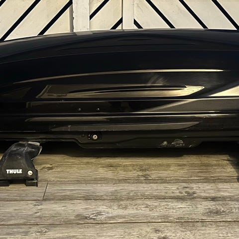 Grå Packline skiboks og Thule takstativ selges samlet for kr. 2000. Takstativet passer til «flush takrails».