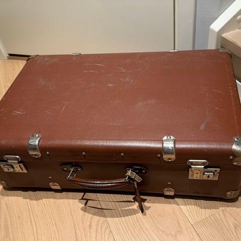 Vintage koffert i brunt skinn med metallbeslag og bærehåndtak. Kofferten har en rektangulær form og er utstyrt med låsemekanismer på toppen. Lås med nøkler.. Pent fòr innvendig.. Skinn reimer.. Passer til oppbevaring og transport av klær og personlige eiendeler.