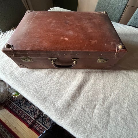 Brun koffert fra tidlig 1900 tallet. Vanlig slitasje gjennom flere år. Låsen funker bra, men jeg har ikke nøkkel.