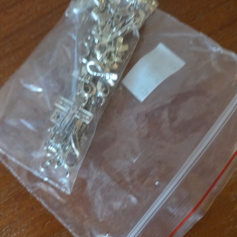 Nytt/ubrukt tvinna perlekjede, armbånd og pyntenål selges samlet kr.80,-(+ porto 38,-) lengde på kjede41+7 cm forlengelse. pyntenål 4x3 cm. Armbånd har strikk og passer de fleste