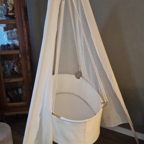 Meget pent brukt Leandervugge med stativ. Nyvasket vugge, madrasstrekk og reimer med sensitiv vaskemiddel uten parfyme, ingen flekker. Madrass følger med. Vært super fornøyd med den og ønsker at noen andre skal få gleden av den også! Vuggen er ren og hel og klar for neste nurk!