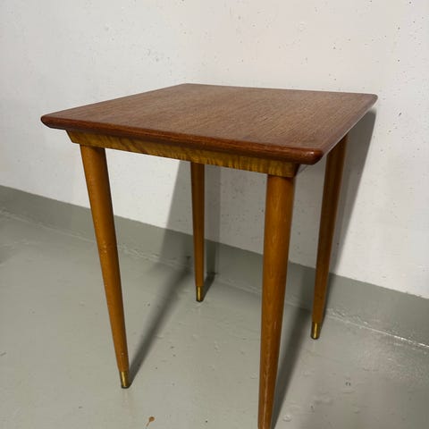 Stilig lite retrobord fra 1950–60-tallet. Bordet har et tidstypisk, minimalistisk design med rette, avsmalnende ben og en enkel, rektangulær bordplate med avrundede hjørner.