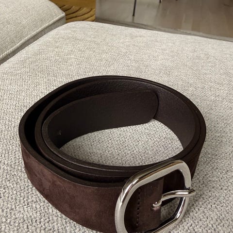 Et utrolig lekkert og unikt belte i ekte skinn. Passer til en XS. Beltet er 77 cm langt og 8 cm bredt. På innerste «knappefeste» passer beltet til en midje på 69 cm, på ytterste til en midje på ca 74 cm. Flott på både kjole, bluse og genser. Et dyrt belte til en fin-fin pris.