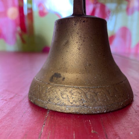 Gammel messingbolle med patina og kjettingfeste. Muligens brukt som røkelseskar eller liten opphengskopp. Diameter ca. 11 cm, høyde ca. 6,5 cm. Fin å bruke som dekor, planteoppheng eller til småting.