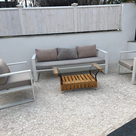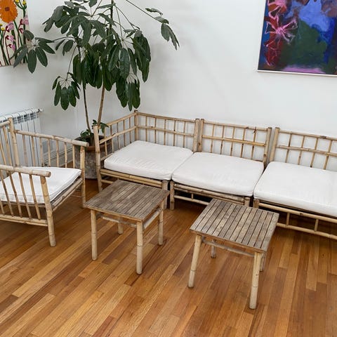 Kjempefine utemøbler i bambus fra Tine K. Modulene kan kombineres på mange måter! Det medfølger hvite sitteputer til alle møblene.
