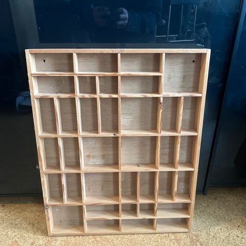 Stilig hylle som ble kjøpt for 2300kr. Den kan henge begge veier: stående og liggende. Kommer også med to støtter som du kan lime på for delegasjon.