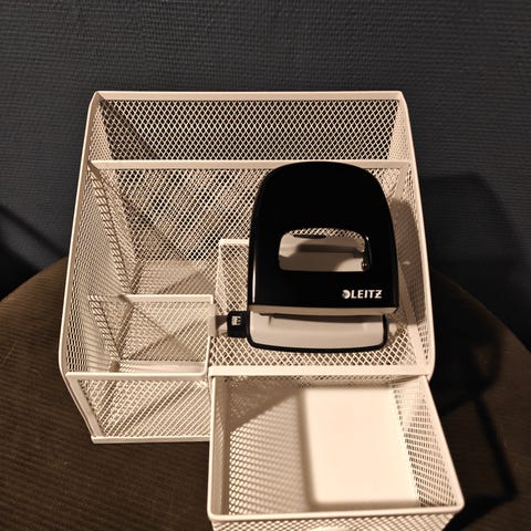 Skrivebordsett i rustfritt stål. Består av post-it- holder, quartzklokke, brevåpner og kulepenn. Kulepennen har tørket inn så den må fornyes. Klokken måler ca 5 x 7 cm.