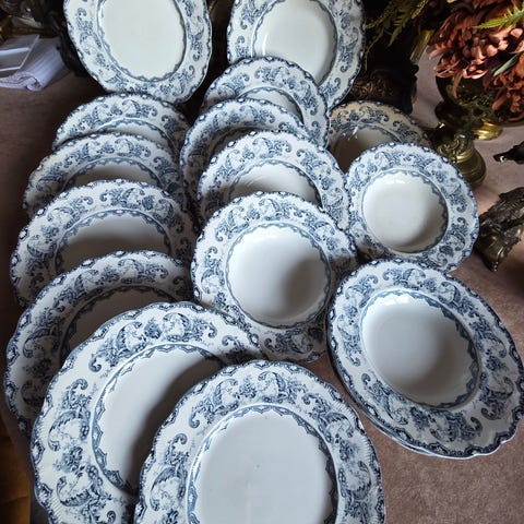 8 store gamle dyptallerkner selges. Også 2 store og 2 små flattallerkner fåes gratis hvis kjøp av dyptallerkner fordi de er litt sprekker i. Tallerknene er av merket concordia.