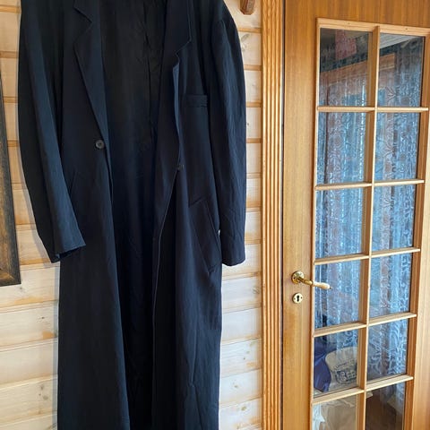 Svart herrefrakk fra 80-90-tallet. Foret. Ullkragen kan tas av. Størrelse er ikke oppgitt, men jeg vurderer den til str 54. Lengde: 102 cm.