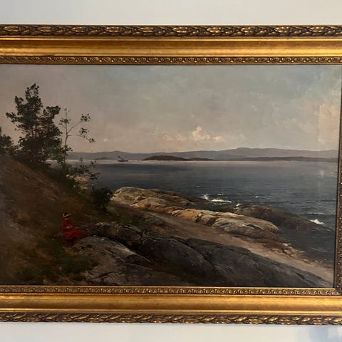 Olje på lerret. Signert nede til høyre: "Asbj. Barstad". Motivet kan være hentet fra en kirke på Sunnmøre. Yttermål ramme: 51 x 68 cm. Noe mindre avskallinger på rammen. Kan sendes.