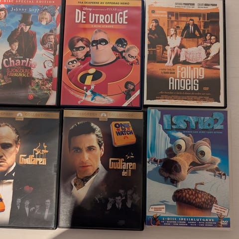 Selger en stor og variert samling DVD-filmer i god stand (pent brukt). Utvalget inkluderer action, komedie, drama, animasjon og klassikere. Flere DVD-er har to filmer på samme plate. Listen over titler oppdateres fortløpende, og nye titler kan bli lagt til.