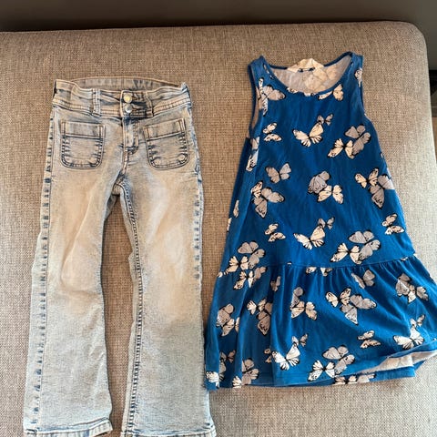 To pene plagg som har vært ekstratøy på hytta. Jeans fra pompdelux str. 152 men kan brettes opp og stramming i livet. Buksedressen er kjøpt i Belgia, veldig søt. 146/152 så begge plagg vil jeg si kan brukes fra 146.