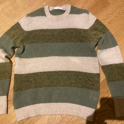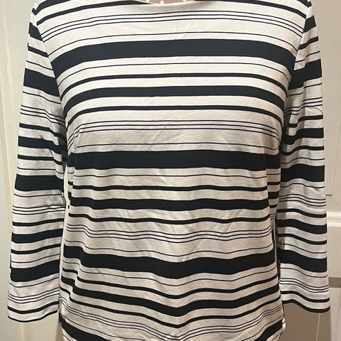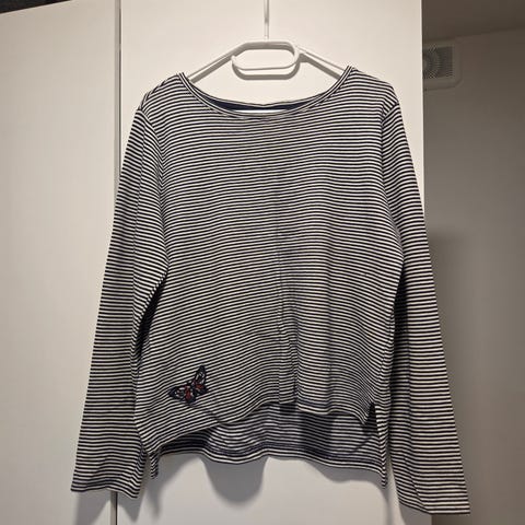Sort og hvit stripete genser med knapper på begge skuldrene