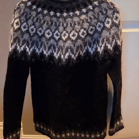 Hjemmestrikket unisex jakthundgenser i str M. Strikket i garn Hillevåg troll&blåne.