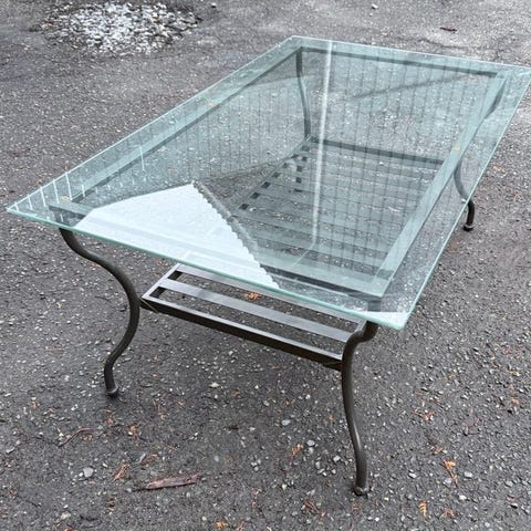 Bord med metallramme og glassplate selges. En del riper i glassplaten, og noe rust på det ene beinet.
