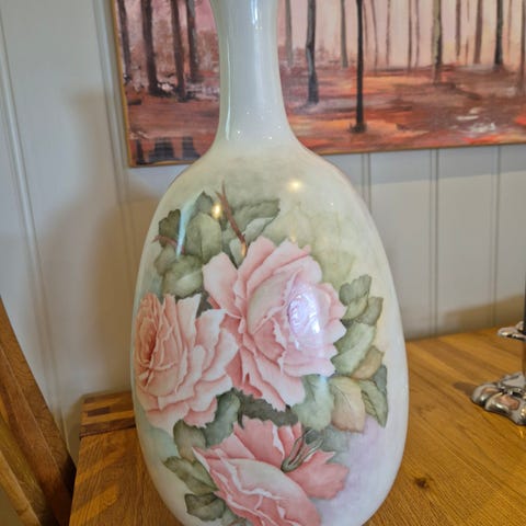 Håndmalt porselens lampe m/ roser og rosa sjerm.