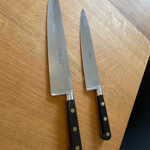 Kokkekniv 20 cm. Brødkniv 20 cm. Urtekniv 9 cm.