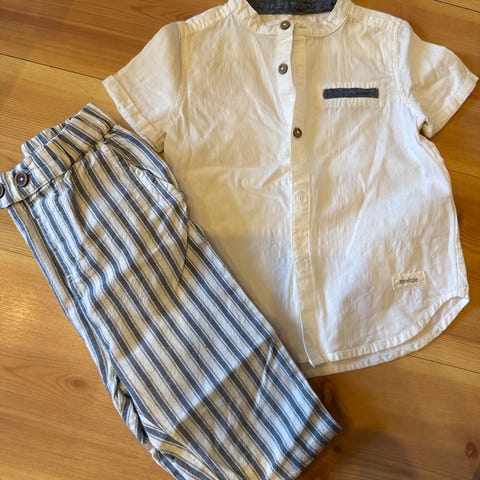 Nydelig sett fra Newbie i deilig lin stoff. Perfekt til varme sommerdager eller besøk. Kjøpt nytt i mai, og brukt til en fotografering i barnehagen. Fremstår som helt nytt , bare vasket. Størrelse 104. Det blir for lite til neste års fotografering så derfor selger vi det nå.